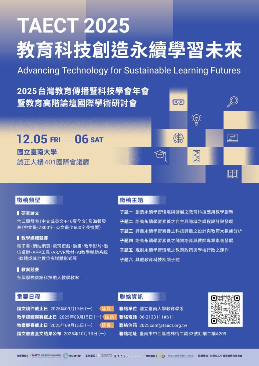TAECT 2025 台灣教育傳播暨科技學會年會暨教育高階論壇國際學術研討會,將於 2025 年 12 月 5 - 6 日 (五、六) 辦理,假國立臺南大學誠正大樓 401 國際會議廳,研討會主題為「教育科技創造永續學習未來(Advancing Technology for Sustainable Learning Futures)」,邀請國內外專家、學者、教學實務工作者參與,就會議擬定相關議題進行研究成果發表,期許在「教育科技創造永續學習未來」之主題進行深入的探究與剖析。